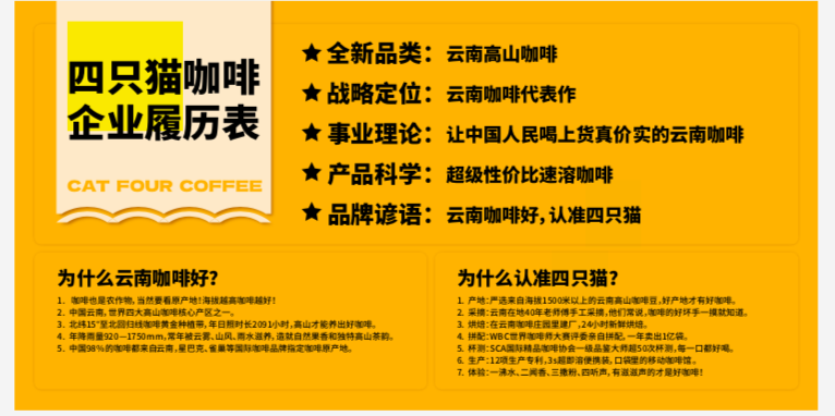 A good brand proverb should integrate strategy and creativity. The greatest advantage of Cat4Coffee is its place of origin. 98% of coffee in China is produced in Yunnan, making it the largest Arabica coffee producer in China. However, most brands either actively or passively pretend to use foreign coffee beans. In fact, Yunnan coffee is often exported at a low price and then sold back to China at a higher price after being packaged and labeled by foreign coffee companies. Customers end up paying a high "premium" price while enjoying their coffee. Due to the concentration of Yunnan coffee in the upstream of the global industry chain and its dependence on international futures market prices, it lacks a well-known place of origin brand and has failed to control pricing. According to media reports, a cup of coffee priced at 30 yuan but only costs Yunnan coffee farmers 20 cents.